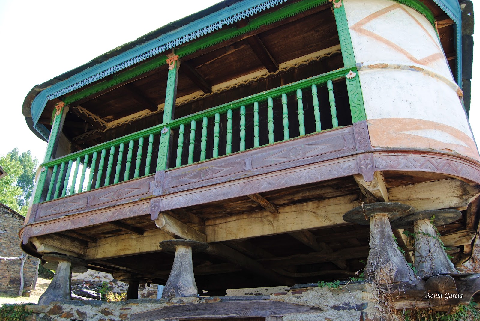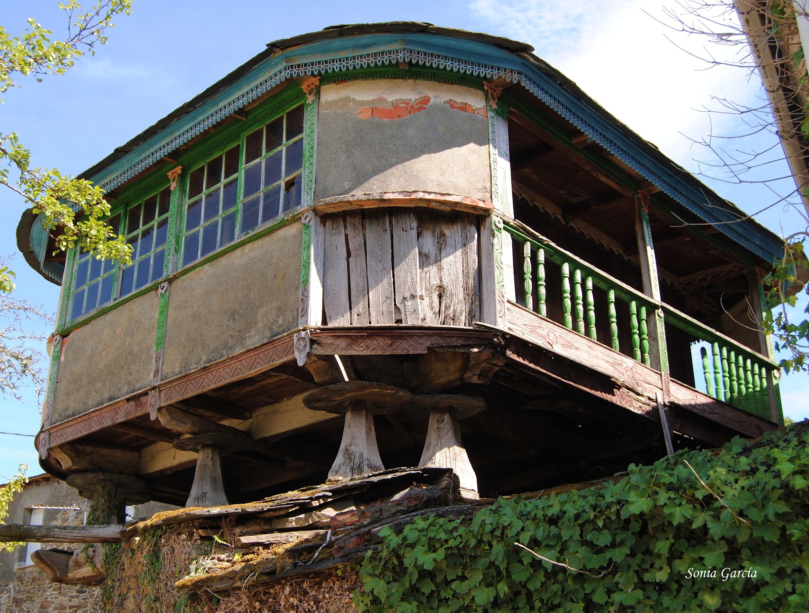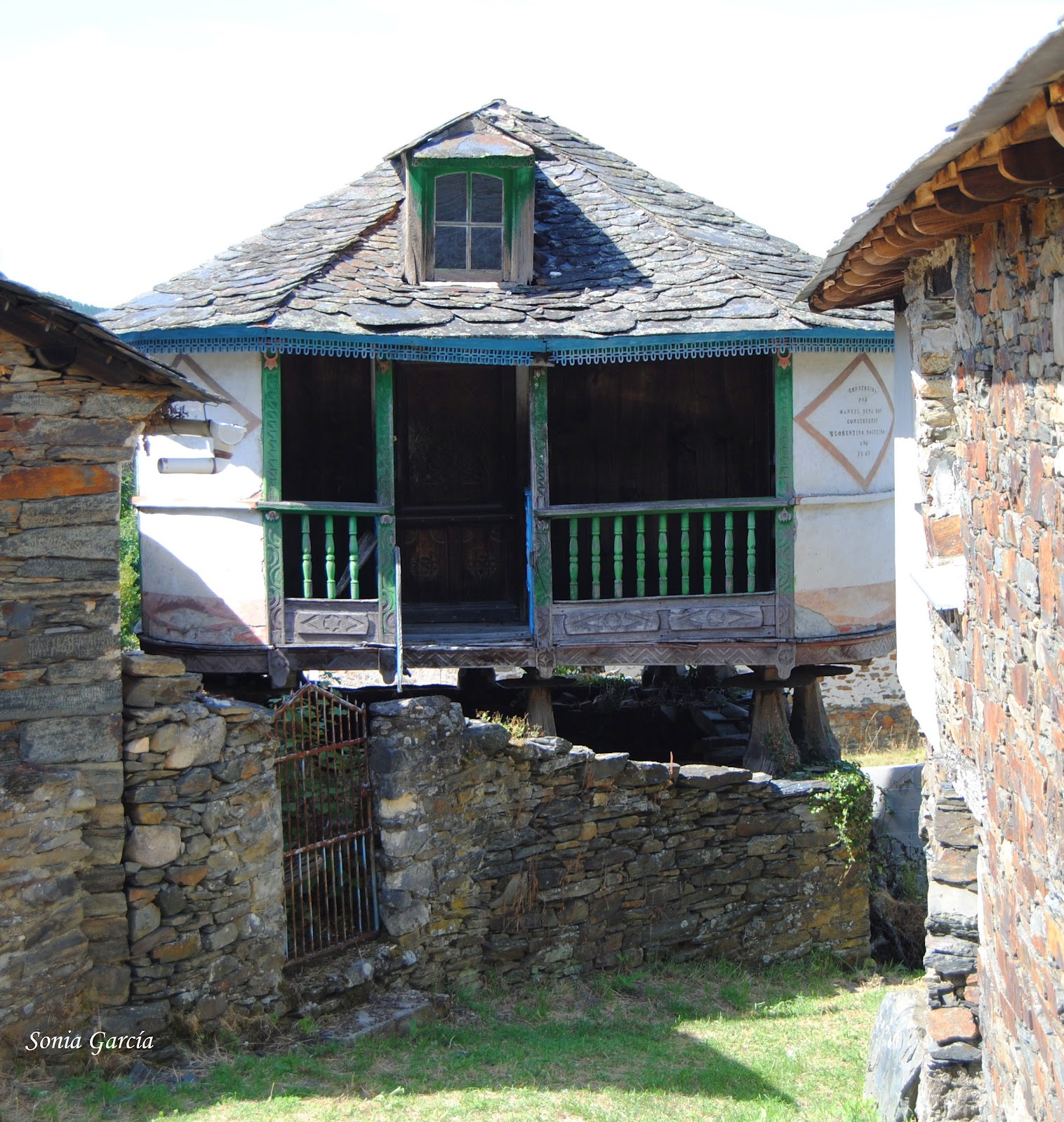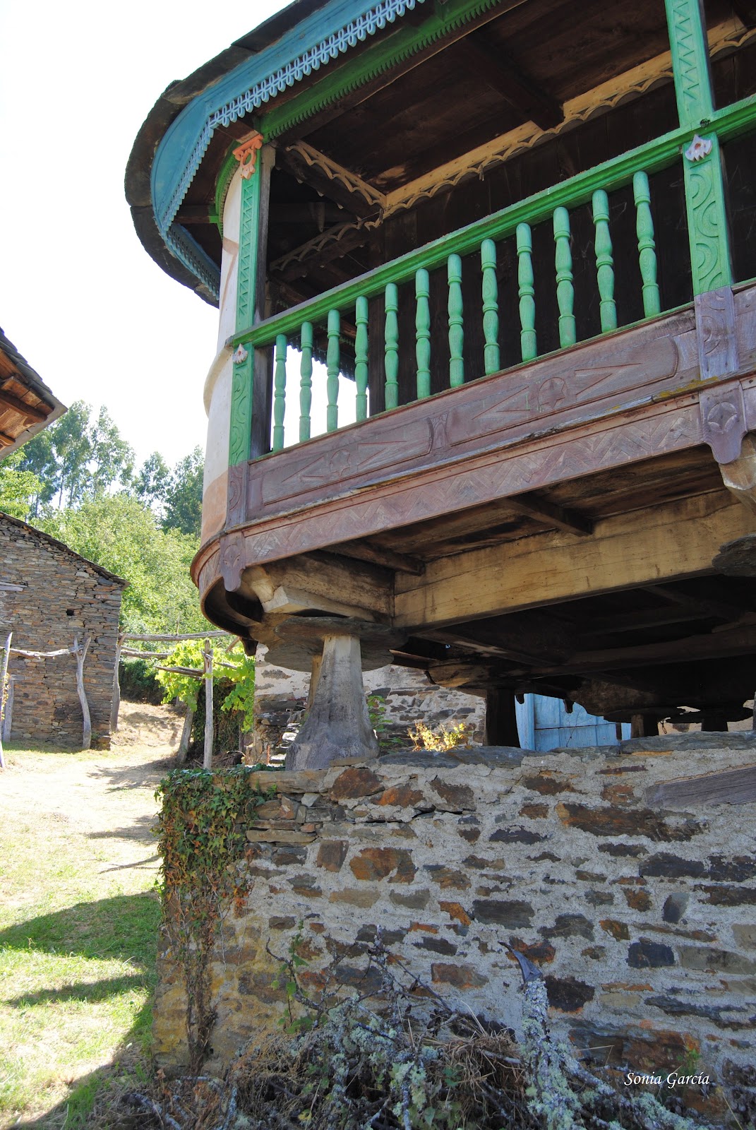 Camino abajo nos topamos con la sorpresa de encontrar la panera de casa Vecentón. Es sin duda la más original de Ibias y se construyó en el año 1949 sobre doce pegollos, muy ornamentada y colorida, para destacar del resto de las paneras del pueblo. Orgullo de su dueño. Además, está bellamente tallada por el maestro carpintero Florentino Nogueira. ¿No os parece una casita de muñecas?