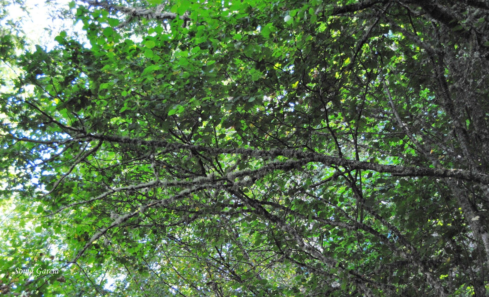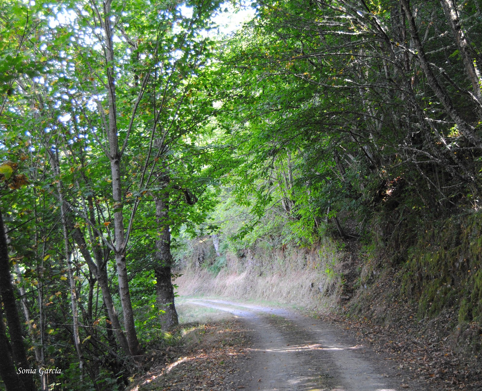 El camino nos rodea y cubre de castaños centenarios, algunos en complicado equilibrio sobre él, pero también vemos multitud de avellanos, abedules, y árboles característicos de estas latitudes.