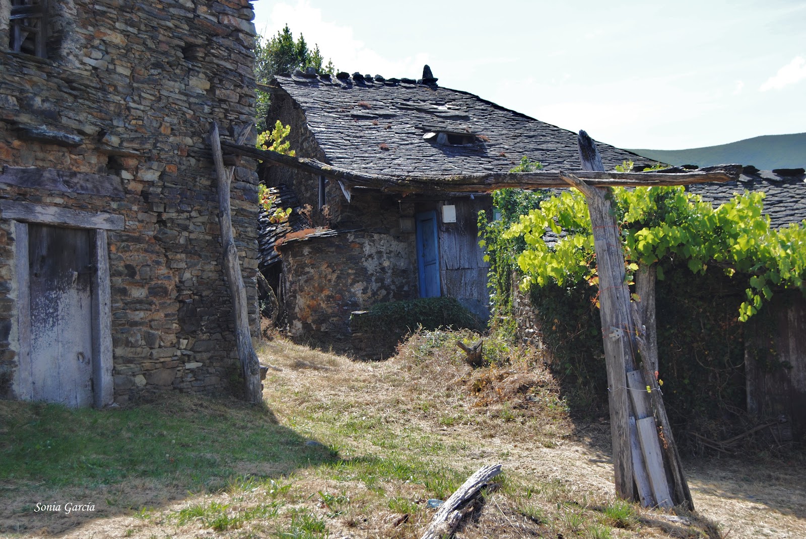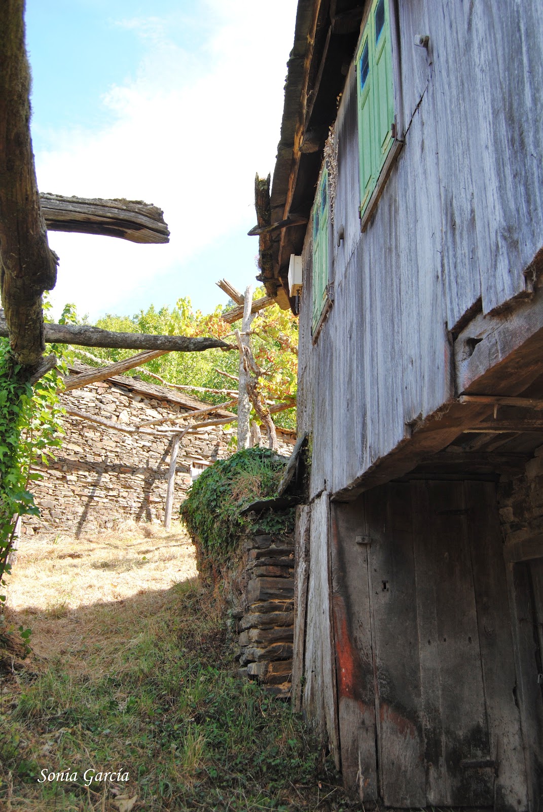 Y llegamos a Santa Comba y el corazón nos da un vuelco. Se abre ante nosotros una aldea de las de antes, sin asfalto en sus caminos, con parras de uvas entre las casas, en silencio, todo paz. La capilla de San Bernardino nos da la bienvenida.
